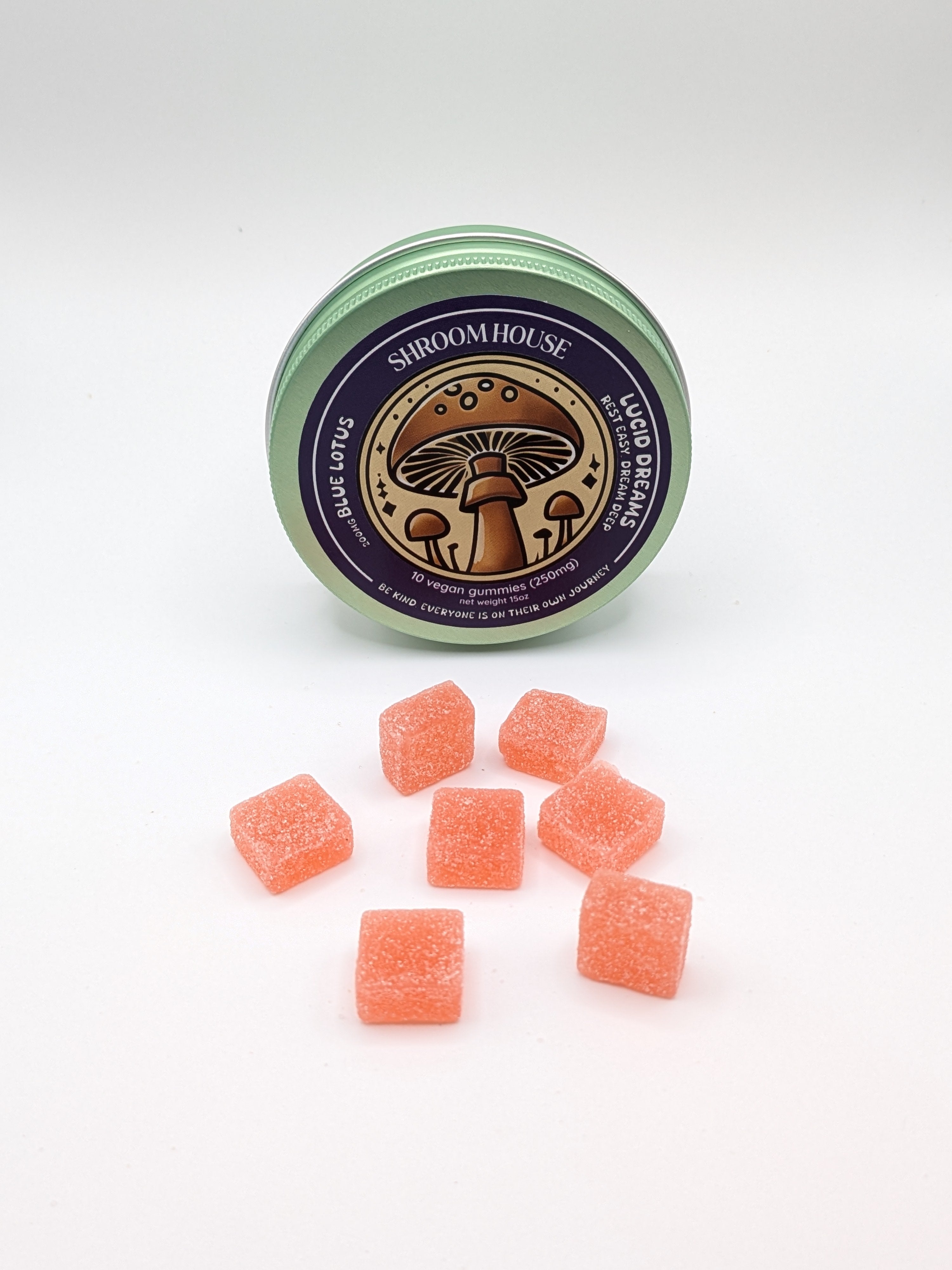 Available in 5-count and 10-count tins, each gummy contains 250mg Shroomhouse Magic Mushroom Extract, paired with 100mg Reishi and 100mg Blue Lotus for dream-friendly calm.